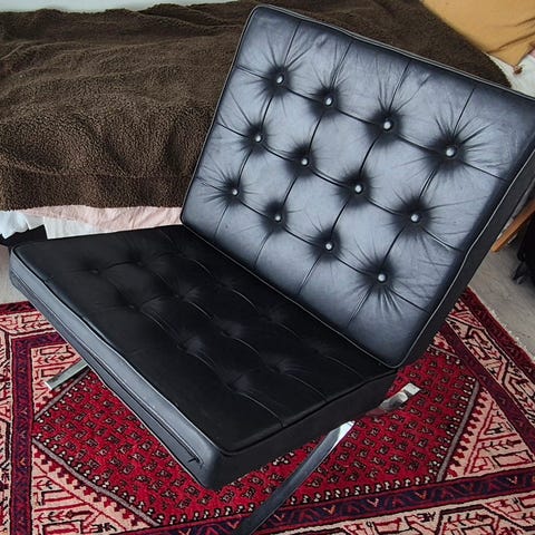 Barcelona tyylinen lepotuoli. Paksua aitoa nahkaa, muistuttaa hyvin läheisesti aitoa Knoll Studiosin aitoa Barcelona tuolia.