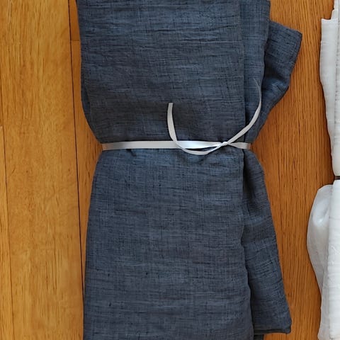 Reunat ommeltu ja lyhennetty itse (ei verhonauhaa). Joitakin langanpätkiä ja pientä nukkaa löytyy varmasti. Lisäksi molempien verhojen yläosassa (eli vastakkaisessa kuin missä isompi käännös) on verhonipsut jättäneet pieniä langanpurkaumia (näkyy kuvissa) nämä huomioitu hinnassa.