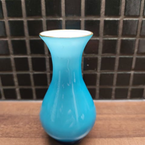 Sininen vintage posliinimaljakko. Pyöreä, hieman pullomainen muoto ja kapea suuaukko. Ulkopinta on lasitettu tummansiniseksi, jossa on pystysuuntaista raitakuviota, sisäpinta on tasaisen sininen. Erittäin kaunis pieni maljakko.5€.