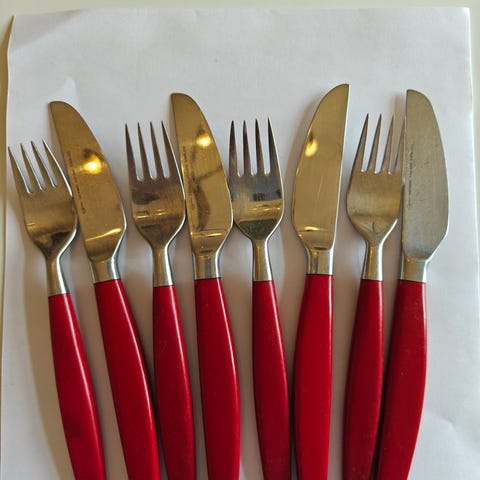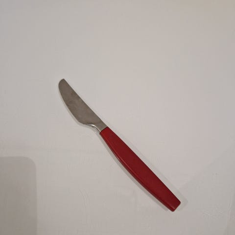 Hackman Lion veitsi punaisella muovikahvalla. Teräosa on metallia. Sopii esimerkiksi ruokailuveitseksi tai yleisveitseksi keittiöön. Pituus 19.8 cm. Veitsi suunnittelija Bertel Gardberg vuonna 1958. Yhteishinta 10 €.