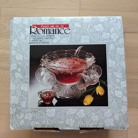 Boolikulho, kauha ja 12 kuppia. Mukana myös s-koukkuja, joilla kupit saa roikkumaan kulhon reunalle.
