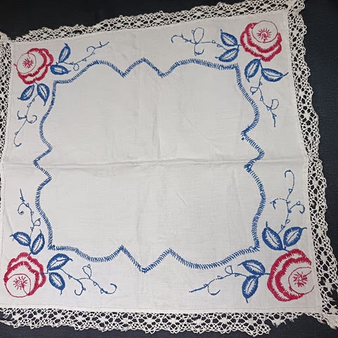 Pitsireunainen pöytäliina, jossa vaalea pohjakangas ja virkattu pitsireuna. Liinassa on ristipistokirjailtu kukkakuvio molemmissa päissä sekä koristeellisia koukerokuvioita ja ristikkoaihetta. Sopii esimerkiksi ruokapöydän, senkin tai lipaston koristeeksi. Värit ovat vaaleapohjaiset, kukkakuvioissa vaaleanpunaisen ja vihreän sävyjä sekä tummempia kirjailuja. Koko 28 x 64 cm. Käsin kirjailtu. Voin lähettää. Mmm.