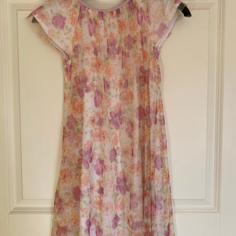 Ihana kesäinen mekko. Ohut puuvillakangas. Itse siististi ommeltu, malli mekkotehtaa. Pitsiä koristeena. Selässä napit. Kunto kuin uusi. Menee monen kokoiselle.