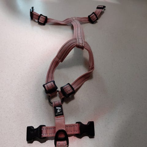 Valjaat pienelle koiralle. Omalle koiralle hankin valjaista luikertelun vuoksi, näissä pysyi ja tottui valjaisiin.
