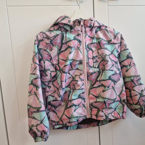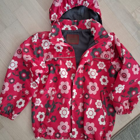 Valko-sinikirjava vedenpitävä ulkoilutakki koossa 130cm. Pientä käytön jälkeä mm.hihansuissa.