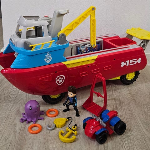 Ryhmä Hau laivuri. Laivan päälle oleva sininen osa liikkuu ja ihan eteen työntämällä tämän saa muutettua laivasta ajoneuvoksi ja pyörät tulevat esiin. Pyörät saa taas takaisin sisään, kun painaa ne sisälle. Laivassa nosturi, koukku ja laskettava peräramppi. Edessä avattava ramppi.
