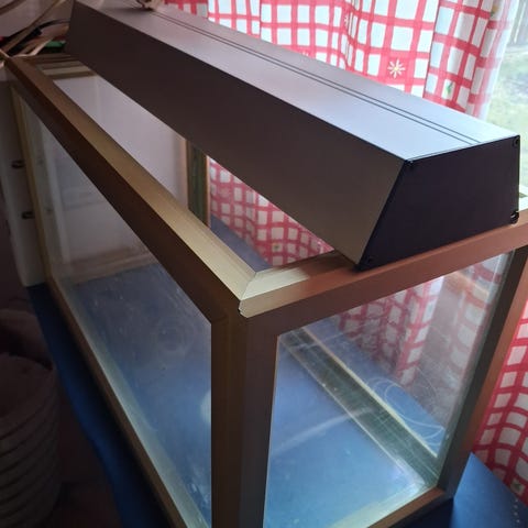 Vanha mutta hyväkuntoinen. Mitat leveys 151 cm, korkeus 51 cm ja syvyys 50 cm. Kaloja ei ole paljon mutta hienot kasvit ym. somistus. Lämmitin, puhdistin ja valo.