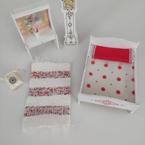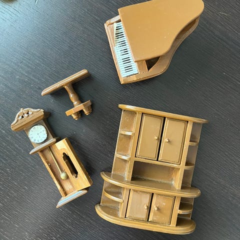 Kaksi vanhaa nukkekodin kalustetta. Vihreän takana teksti WGermany. Jotain pientä käytön jälkeä näkyvissä.