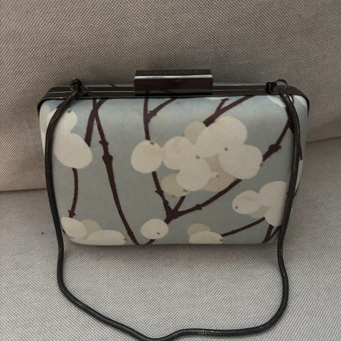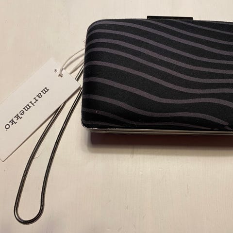 Marimekko kangaslaukku naisille. Laukussa on kovareunainen runko ja monivärinen kangaspäällinen, jossa on leveitä väriraitoja. Olkahihna on ohut ja tumma, ja laukku sulkeutuu metallisella kehyslukolla, jossa Marimekko-logo. Sisäpuoli on vaalea ja siinä on pieni tasku. Soveltuu esimerkiksi juhla- tai iltalaukuksi henkilökohtaisille tavaroille, kuten lompakolle ja avaimille.