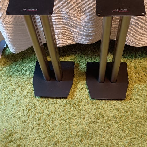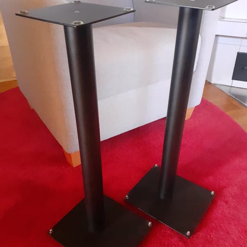 Alphason kaiutinjalustat. Korkeus 61,5cm. Alustan neliö on 16,5cm * 16,5cm. Jotain kulumaa pinnoissa. Läpiviennit takana.