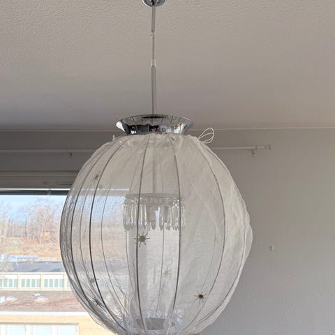 Kattovalaisin kristallikoristeilla, metallikehikko. Korkeus n. 65 cm, säädettävissä pidemmäksi.