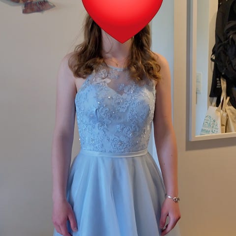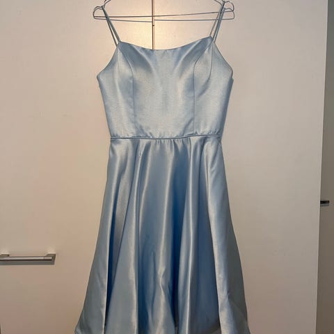 Vaaleansininen satiininen juhlamekko Dazzling by Zazabella. Takana narunyöritys. Ostettu uutena Zazabellasta, ollut käytössä kaksissa rippijuhlssa. Ovh 189€.