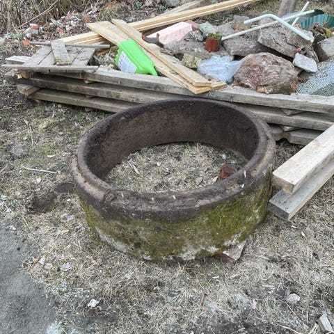 Kaivon kansi. Ulkohalkaisija noin 117cm eli 100cm kaivoon. Joku on väkertänyt letkulle reiän kanteen. Uros-mallinen, mutta ei mitään tekemistä Uros liven kanssa. Saat sammaleet kaupan päälle.