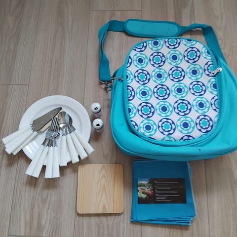 piknikkori astiasto muovia. Korissa on sisällä muovisia kertakäyttö- tai uudelleenkäytettäviä astioita, kuten viinilaseja, lautasia, mukeja ja muoviaterimia. Astiat on pakattu muoviin ja kori on sisältä ruudullinen. Sopii ruoan ja juomien kuljettamiseen ja kattaukseen ulkona tai matkalla.