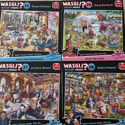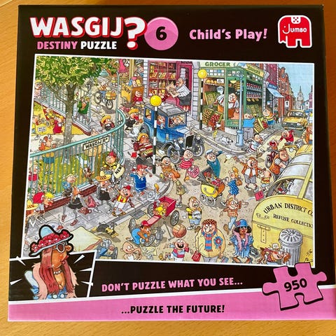 Uutena ostetut ja kerran kasatut Wasgij Retro Destiny 9 Super Models ja Destiny 10 High Street Hassle palapelit. Molemmat uudempaa painosta, pienemmät kannet 25x25cm. Muutaman palasen reuna irvistää.