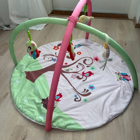 Rakastettu ja paljon pesty leikkimatto leluineen. Osa leluista helistimiä ja yhdessä sisällä soittopeli. Meillä oli pitkään hitti, kun kaarien asentoa sai säädettyä ja sen myötä lelujen korkeutta ja paikkaa.