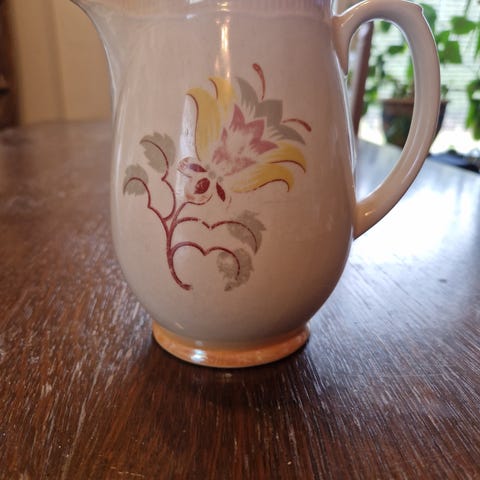 Keraaminen maitokannu, jossa kukkakuviointi kyljissä. Valkoisella pohjalla sinisiä ja vihreitä kukka- ja lehtikuvioita. . Pohjassa on valmistajamerkintä, joka taitaa olla Arabian II laadun merkki