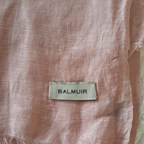 Muutaman kerran käytetty. Balmuirin vaaleanpunainen pellavahuivi (80 % pellavaa, 20 % modaalia). Koko noin 200 cm x 60 cm. Hieman kuin pliseerattu pinta. Hyvin laskeutuva. Väri marjapuuronpunaisern taittava.