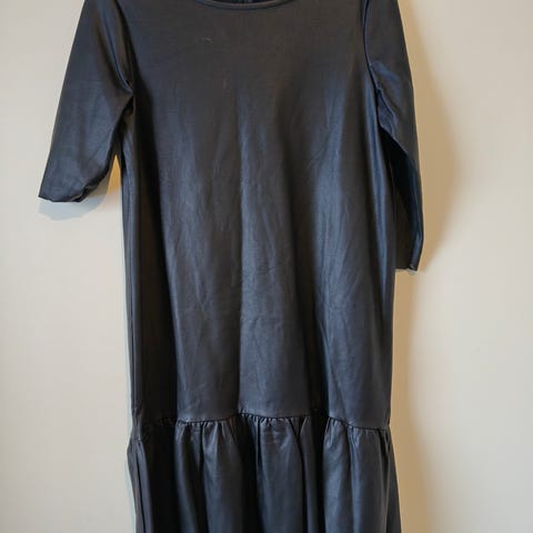 Musta mekko, edessä napitus ja kietaisunauhat. Pitsia olkaillä ja lahkeessa. Koko 34.