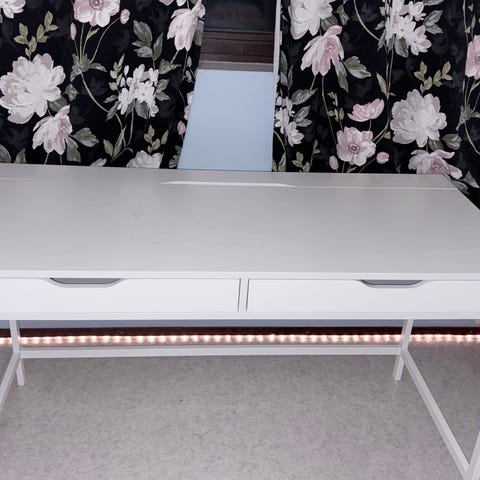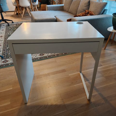 IKEA työpöytä, valkoinen. Pöydässä on keskellä avoin jalkatila ja molemmilla sivuilla säilytystilaa: toisella puolella kaappi hyllyllä ja toisella puolella vetolaatikoita. Kuvissa näkyy joitakin käytön jälkiä, olleet jo ostaessa. Pöytä on massiivi puuta (tukeva ja painava), pinnassa siis puunsyiden mukaisia kulumia. Suojattu käytössä kirjoitusalustoilla (saa halutessa mukaan). Nouto.
