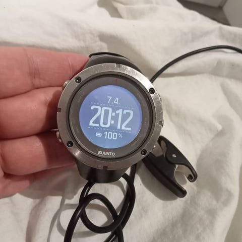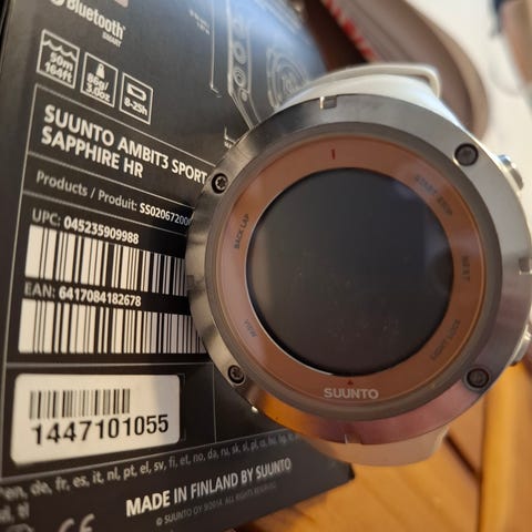 Suunto Ambit3 urheilukello mustalla rannekkeella ja sykevyöllä. Kellossa on pyöreä näyttö ja metallinvärinen kehys. Takakannen merkintöjen mukaan kyseessä on Ambit3-malli, jossa on GPS- ja Bluetooth-ominaisuudet. Kellon mukana on kuvissa näkyvä musta ranneke. Soveltuu yleiseen urheilun ja ulkoilun seurantaan sekä ajan näyttämiseen.