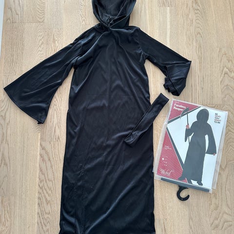 Annetaan Viikatemiehen mekko/kaapu (koko 140 cm) ja irrallinen huppuosa. Hupun etuosa on verkkokangasta eli kasvot ei näy sen läpi.
