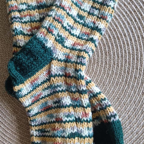 Myydään uudet, käsinkudotut naisten ohuet pitsiset villasukat. Väreinä kirjava lanka, jossa mm. turkoosin, sinisen, oranssin, vihreän ja violetin sävyjä. Kantapää vahvistettua neulosta. Pohjan pituus kantapäästä kärkeen n. 25 cm. Varren pituus n. 16 cm. Sukat sopivat noin 38/39 kokoiseen jalkaan. Lankana ohut 4 säikeinen Opal (75% villaa ja 25% polyamidia). Konepesu 30 astetta.