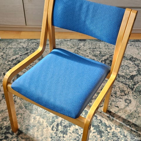 Kari 3 pyöreällä selkänojalla. Toinen takajalka ilmeisesti teetetty itse. On kuitenkin tukeva eikä keiku.