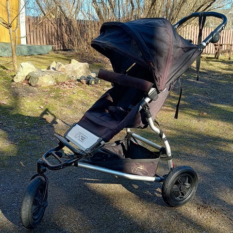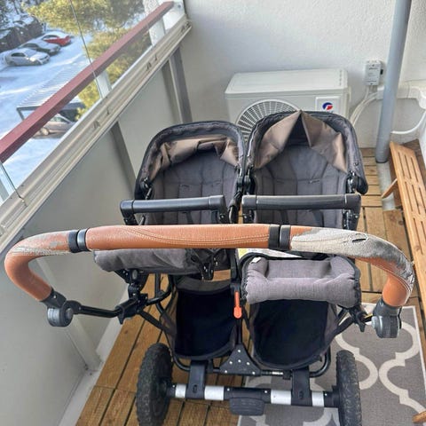 Mountain Buggy tuplarattaat kahdelle lapselle. Kevyet ja ketterät, pääsee yllättävän ketterästi epätasaisilla alustoilla. Bussissa kätevät.