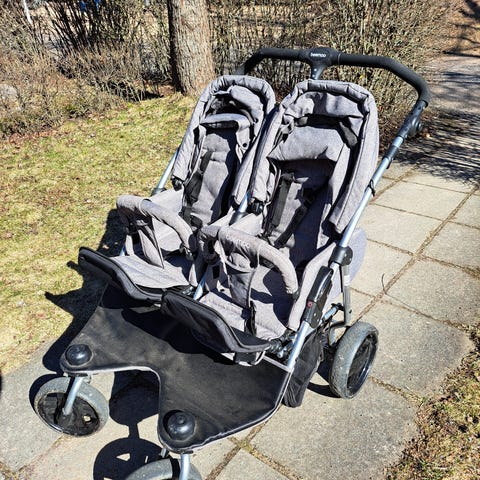 Edessä on kaksi kääntyvää rengasta, jotka voi lukita. Takana kaksi kiinteää rengasta, kaikki ilmakumirenkailla. Rattaissa on vierekkäiset istuimet, erikseen säädettävät kuomut ja turvavyöt. Runko on metallinen ja renkaat ilmakumiset, mikä helpottaa liikkumista epätasaisilla alustoilla. Työntöaisa on säädettävä ja alla on tavarakori pienten kantamusten kuljettamiseen, myös lisäksi kaksi vetoketjullista taskua. Väri on musta, mutta paikoin haalistunut. Renkaiden jarrut toimii, sekä lisäksi on myös käsijarru helpottamassa alamäessä.