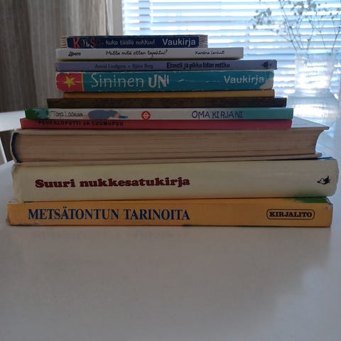 Kirjapaketti, jossa useita pokkareita ja kovakantisia kirjoja eri kirjailijoilta.