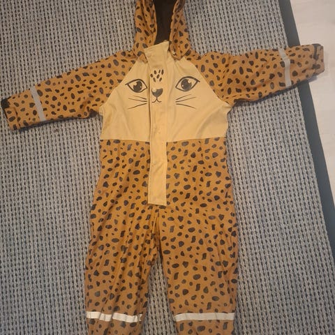 Vuorellinen kurahaalari koko 98. Ehkä ja pitää vettä. Heijastinnauhat kuluneet ja osa saumoista kuluneita, mutta ehjiä. Yksi nappi lähtenyt, mutta ei haittaa, sillä vetskari on pääasiallinen kiinnitystapa ja napit tulevat vetskarin päälle. Pepussa viilto, joka ei ole kankaasta läpi.