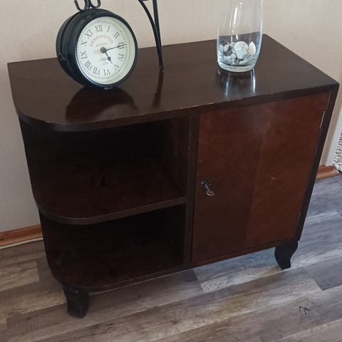 Kannet nousee ylös, ja edestä aukeaa kaksi kaappia. Tee tästä unelmiesi levysoitinlipasto tai baarikaappi,tai pidä tälläisenään. Pinnassa muutama jälki muistona kukkaruukusta, muutoin pinnat on hyvät ikäänsä nähden. Radio poistettu, joten sisälle mahtuu tavaraa vaikka ja kuinka. Kulkeutuu omien menojen mukaan kauemmaskin. Tarjoa.