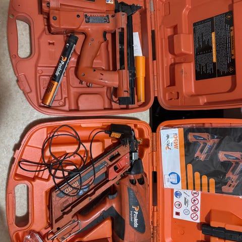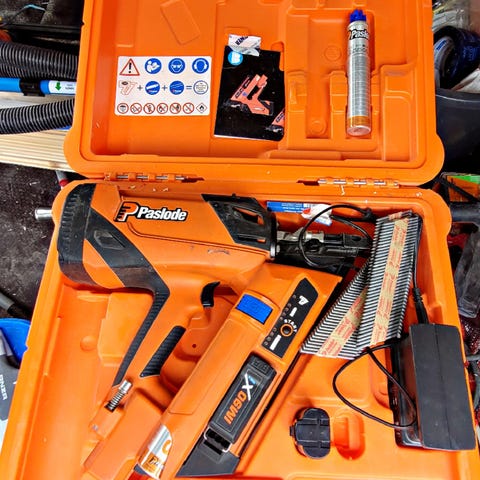 Paslode IM90i naulain. Kaasutoiminen runkonaulain puutöihin ja rakennuskohteisiin. Kaksi akkua ja laturi