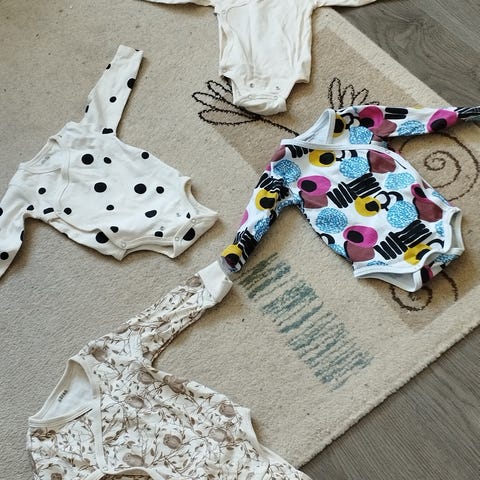 Vauvan bodyt. Kaksi kokoa 3-6kk ja kolme kokoa 6-12 kk. Kaikki yhteensä 6€
