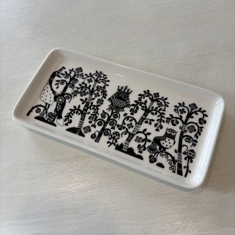 Taika-lautanen sopii loistavasti ruokalautaseksi tai tarjoiluvadiksi. Pöllöaiheisen kuvioinnin runsaat yksityiskohdat korostuvat tyylikkään mustavalkoisessa lautasessa ja koristavat myös lautasen reunaa. Yhdistele rohkeasti eri värisiä astioita eloisaksi kokonaisuudeksi, pelkistetymmän ilmeen luomiseksi Taikaa voi yhdistellä minimalistisen Teema-sarjan kanssa.