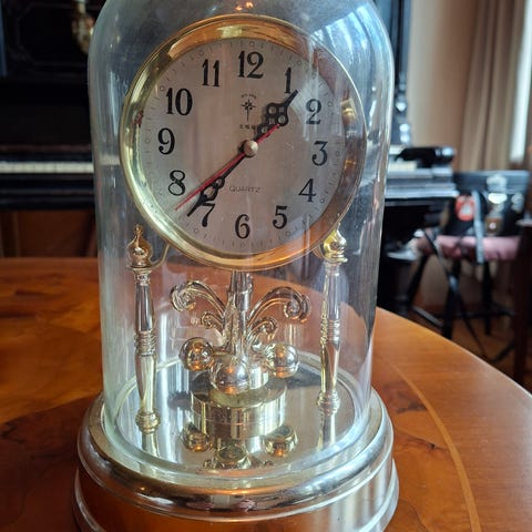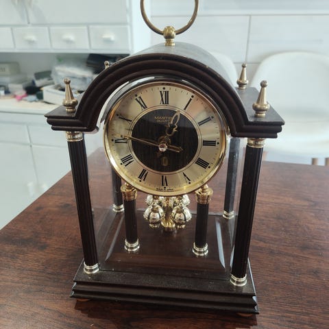 Hermle kupukello, jossa koristeellinen kullanvärinen kellotaulu roomalaisin numeroin. Kello on suojattu kirkkaalla lasikuvulla ja siinä on messingin sävyinen jalusta ja pylväät. Mekanismissa on heiluripallot, jotka liikkuvat kellon käydessä. Toimivuus epävarma.