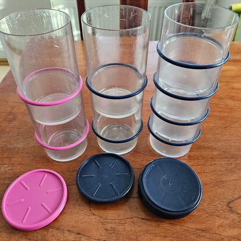 Tupperware keittiötarvikesetti muovi monivärinen. Settiin kuuluu kannellinen säilytysrasia, pyöreä kannellinen säilytysastia, silikoninen tai joustava muotti pienille leivonnaisille sekä jaollinen tarjoilu- tai säilytysalusta. Soveltuu esimerkiksi eväiden säilytykseen, pienten leivonnaisten tai makeisten valmistukseen sekä erilaisten ruokien erotteluun ja tarjoiluun. Kaikki osat ovat monivärisiä ja valmistettu pääosin muovista.
