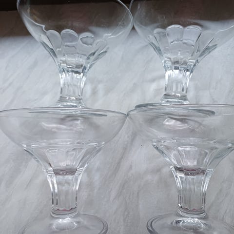 Lasiset jälkiruokamaljat. Kirkkaasta lasista valmistetut jalalliset kulhot, joissa on aaltoileva reuna. Sopivat esimerkiksi jäätelön, jälkiruokien tai pienten annosten tarjoiluun. Kuvissa kaksi samanlaista maljaa. Myydään yhdessä, hinta 6€ on molemmista kulhoista.