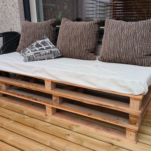 Eurolavoista koottu sohva ulkokäyttöön. Lavoista ulospäin näkyvä osa maalattu valkoiseksi. 6 lavaa ja istuinpehmuste, jossa oma vaalea päällyste sekä kuvassa oleva värikäs lakana lisäsuojana.