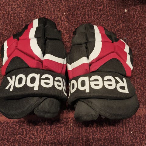 Reebok 5K jääkiekkohanskat. Väri musta/punainen valkoisilla yksityiskohdilla. Hanskoissa on sormien ja rystysten pehmusteet sekä ranteen tarrakiristys. Soveltuvat jääkiekkoon ja muuhun jäällä pelattavaan mailapeliin.