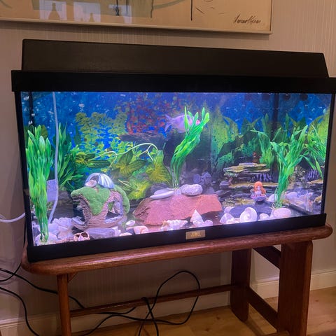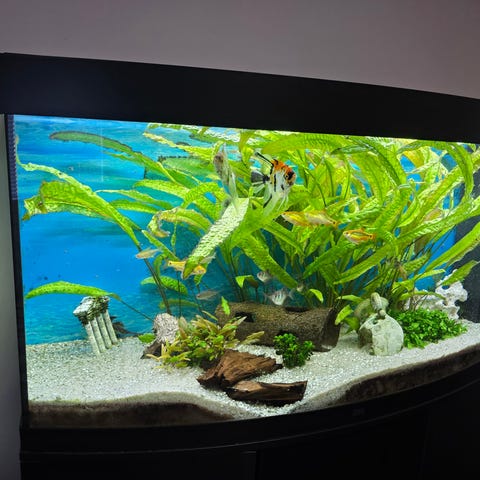 Giant akvaario ja valaisin. 180L, pituus 100cm, leveys 40cm ja korkeus 45cm. Muutama pieni ja huomaamaton naarmu laseissa on. Silikoneissa hieman levää jota saa luultavasti puhdistettua ainakin osittain pois. Lamppu testattu toimivaksi.