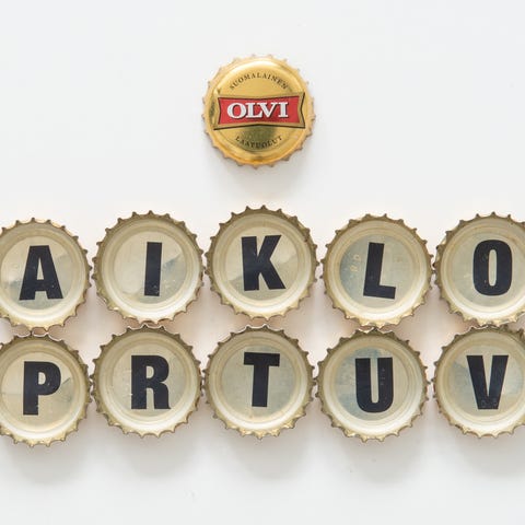 Olvin kaljapullon korkkeja, sisäpuolella kysymys ja vastaus.