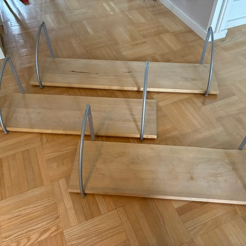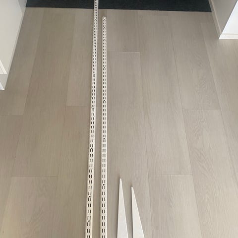 Vaatehuoneesta pois puretut seinäkiskot sekä kannakkeet. Kiskoja 11 kpl, pituus noin 200cm. Kannakkeita reilusti yli 20kpl. Pituus pääosin 47-50cm.