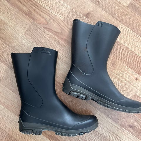 Esmara kumisaappaat koossa 39. Lyhytvartinen malli, musta väri ja kiiltävä pinta. Sivulla joustavat paneelit ja takana vetolenkit helpottamassa pukemista. Paksu kuvioitu pohja tarjoaa pitoa märällä alustalla. Soveltuvat arkeen ja sateiselle säälle.