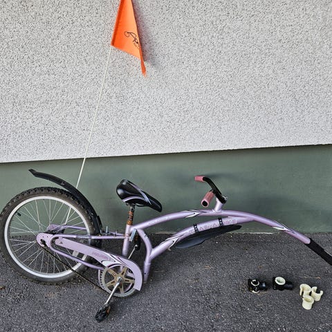 Lasten peräpyörä 20" renkaalla. Väri musta, rungossa heijastimia. Kiinnittyy aikuisen polkupyörän satulaputkeen kuvassa näkyvällä kiinnikkeellä. Sopii lapselle, joka osaa jo polkea, mutta tarvitsee vielä aikuisen pyörän vetoapua. Käytettävissä esimerkiksi pidemmillä matkoilla tai työmatkojen yhteydessä. Renkaat tyhjät, tulee täyttää itse. Vain nouto.