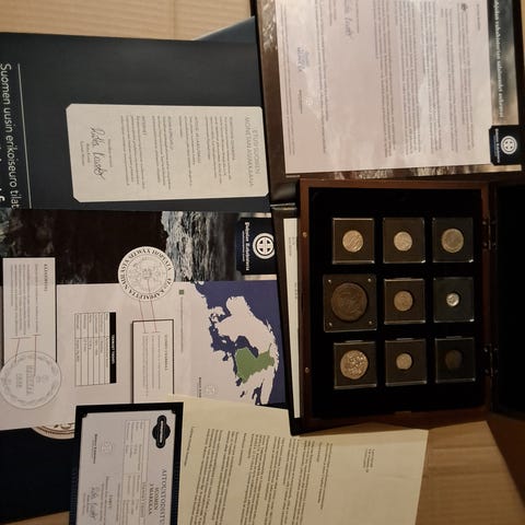 Suomen Rahapaja Suomen viimeiset markat rahasarja ja Suomen rahahistoria kolikkosarja. Kuvatun kokonaisuuden mukana on Suomen viimeiset markat -rahasarja alkuperäisessä kansiossa sekä useita erikoisrahoja ja muistokolikoita läpinäkyvissä suojakapseleissa. Lisäksi mukana on puinen kolikkokotelo, jossa on useita Suomen rahahistoriaan liittyviä kolikoita omissa paikoissaan. Sarjoissa on erilaisia teemoitettuja kolikoita, muun muassa Lottasvärd-aiheisia rahoja. Soveltuu kokoelmaksi numismatiikasta kiinnostuneelle tai Suomen rahahistoriaa dokumentoivaksi kokonaisuudeksi.