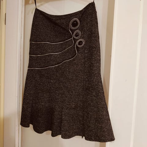 Lyhyt puolihame, koko 38/40. Pehmeää, melko paksua farkkumaista kevyesti joustavaa kangasta. Etutaskut ja rypytystä edessä. Vetoketju takana keskellä. Helma kapenee vähän alaspäin. Siististi ommeltu.
