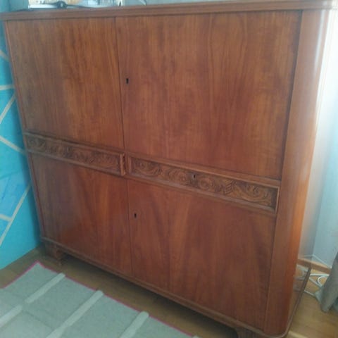 Puinen, talonpoikaishenkinen kaappi, jossa kaksi ovea ja koristeelliset kaiverrukset ovipaneeleissa. Kaapissa on metalliset vetimet ja alareunassa laatikko. Sopii säilytykseen esimerkiksi olohuoneessa, eteisessä tai makuuhuoneessa. Ulkonäkö viittaa perinteiseen tai rustiikkiseen tyyliin.