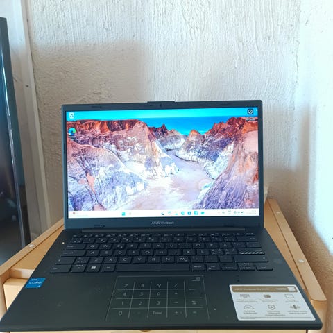 Asus VivoBook S14 -kannettava tietokone, jossa 14 tuuman näyttö. Väriltään harmaa. Näytössä on kapeareunainen NanoEdge-rakenne. Malli on kevyt ja suunniteltu helposti mukana kuljetettavaksi. Laitteessa on SuperBattery-tekniikkaa hyödyntävä akku. Mukana virtalähde ja virtajohto.